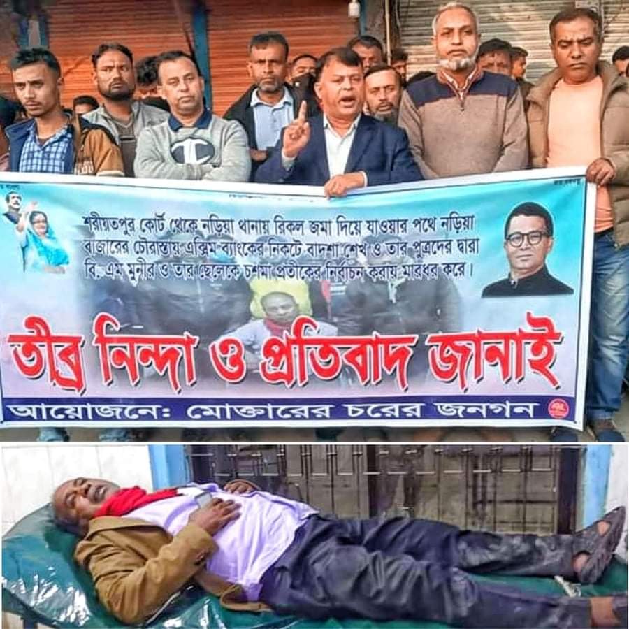 শরীয়তপুরের নড়িয়া উপজেলার সাবেক ভাইস চেয়ারম্যান, নড়িয়া উপজেলা ছাত্রলীগের সাবেক সাধারণ সম্পাদক ও নড়িয়া উপজেলা যুবলীগের সাবেক সভাপতি বিএম মনির (৫৩) ও তার ছেলে রাজ বেপারীর (২১) উপর হামলার প্রতিবাদে বিক্ষোভ মিছিল ও সমাবেশ হয়েছে। বুধবার বিকেলে নড়িয়া-জাজিরা সড়কে এই বিক্ষোভ মিছিল ও সমাবেশ করে মোক্তারের চর ইউনিয়নের শতাধিক মানুষ। সমাবেশে বক্তব্য রাখেন মোক্তারের চর ইউনিয়নের সাবেক চেয়ারম্যান শাহ আলম চৌকিদার ও বিএম সিরাজ।