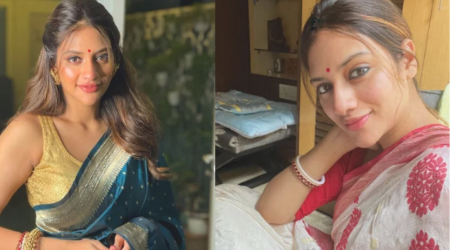ছবিটিতে দেখা গেছে - গাঢ় ফিরোজা রঙের শাড়িতে নুসরাত জাহান। তার হাতে রয়েছে শাঁখা-পলা। কপালে রয়েছে লাল টিপ।